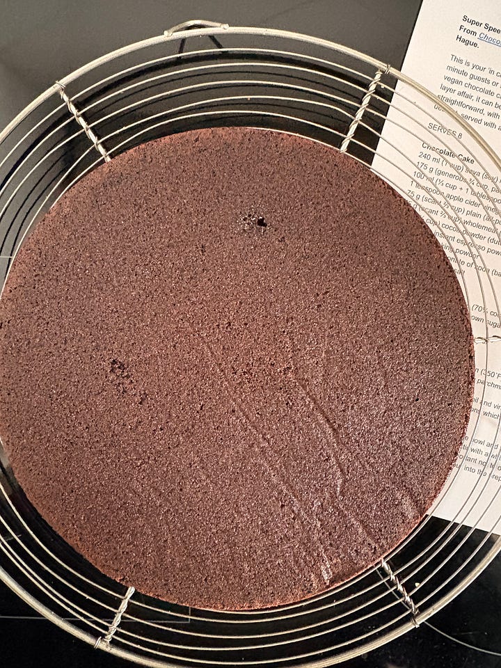 The cake is made with soy milk and oil and it gets its dark color and rich taste from Dutch-processed cocoa. All of the ingredients are standard supermarket gettable — there’s nothing unusual in the mix. What was unusual to me was the ganache glaze — it’s made with water, not cream. I’d read about water ganache, but had never made it. For me it was a revelation. Also a convenience — I don’t always have cream (the base of traditional ganache) in the fridge, but there’s always water.