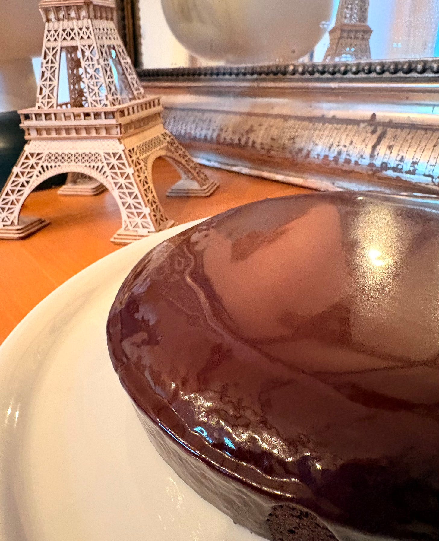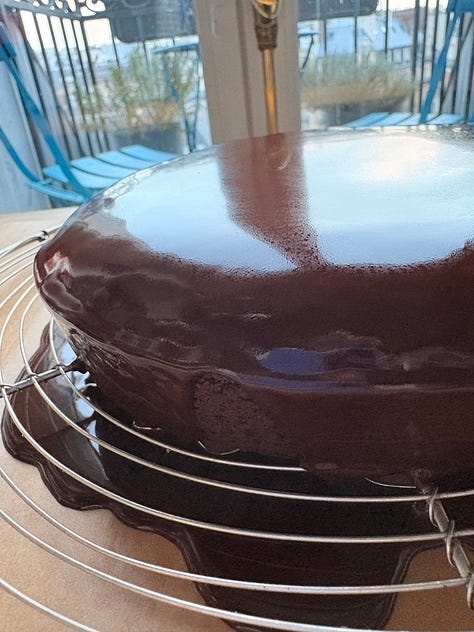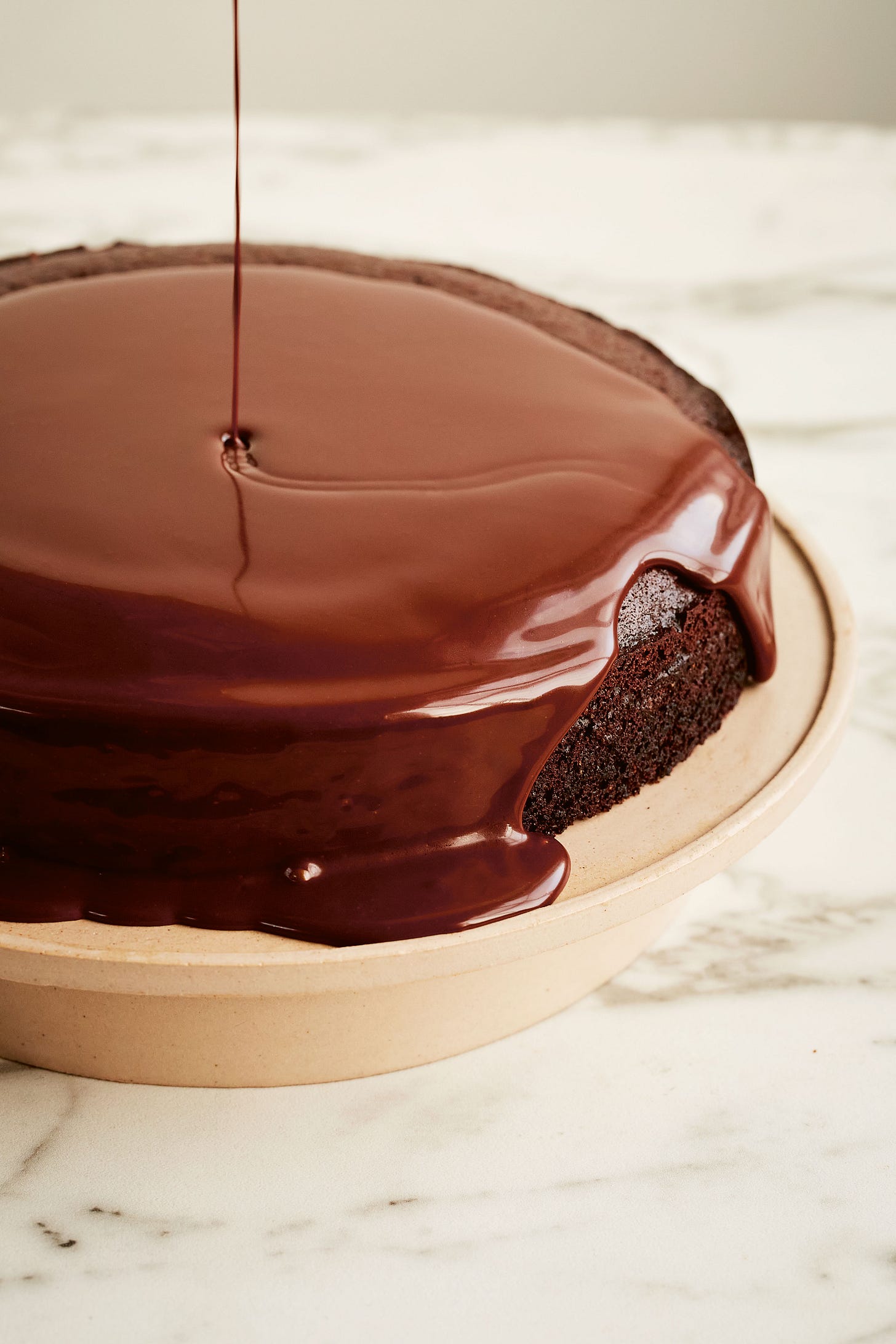 The ganache has a glorious shine when it’s first made and then, as is true with most chocolate glazes, it dries to a matte finish. The matte finish is its own kind of elegant, but if you’re looking for gloss, it’s easy to get it — all you need is a hairdryer. A few puffs of warm air and the ganache will gleam. Not forever, but for long enough to bring the cake to the table with a ta-da!