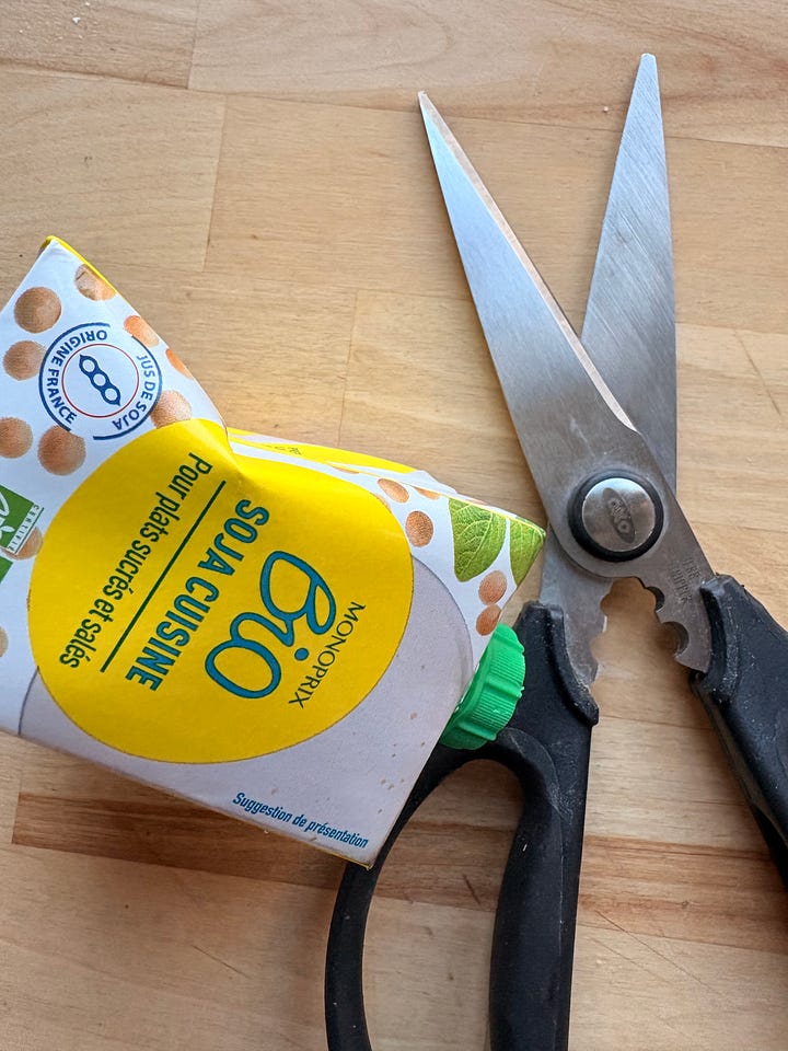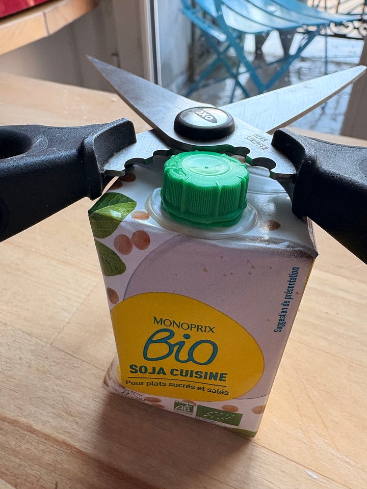 The milk: Because I’m not a regular soy milk buyer, and because I was shopping in Paris, I had a bit of label-reading to do. There were “drinks” and “beverages” available and soy milk for cooking, which is what I chose (and what I couldn’t open — I was ready to stab the package out of frustration).