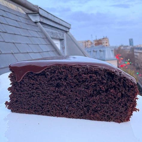 Greetings from the whirlwind. I’m in Japan, collecting memories and sweet things to tell you about when I’m back in Paris and at my “real” desk, the one that alternates between my dining room and a cozy corner of Les Editeurs. But, because a girl can go nuts making lists and packing, trying to be in touch with people who are 9 time zones away and figuring out how many devices is the bare minimum and how many power plugs and charger cords is just right, I baked a bunch before I left my little kitchen. It was fun, it was delicious and there was enough chocolate cake leftover to bring to friends who understand that when I’m testing, there’ll always be a piece or three missing. With today’s recipe, the missing number was four — Michael and I loved it.