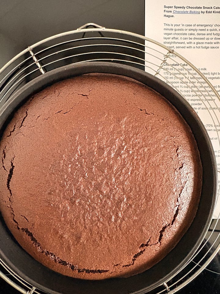 Call me shallow, but I was drawn to this recipe by its name: Super Speedy Chocolate Snack Cake — five words, each lovable. And the image — that languid flow of glaze. That the cake ended up tasting like a sturdy devil’s food cake, was the win. That it “also happens to be” vegan was the bonus.
