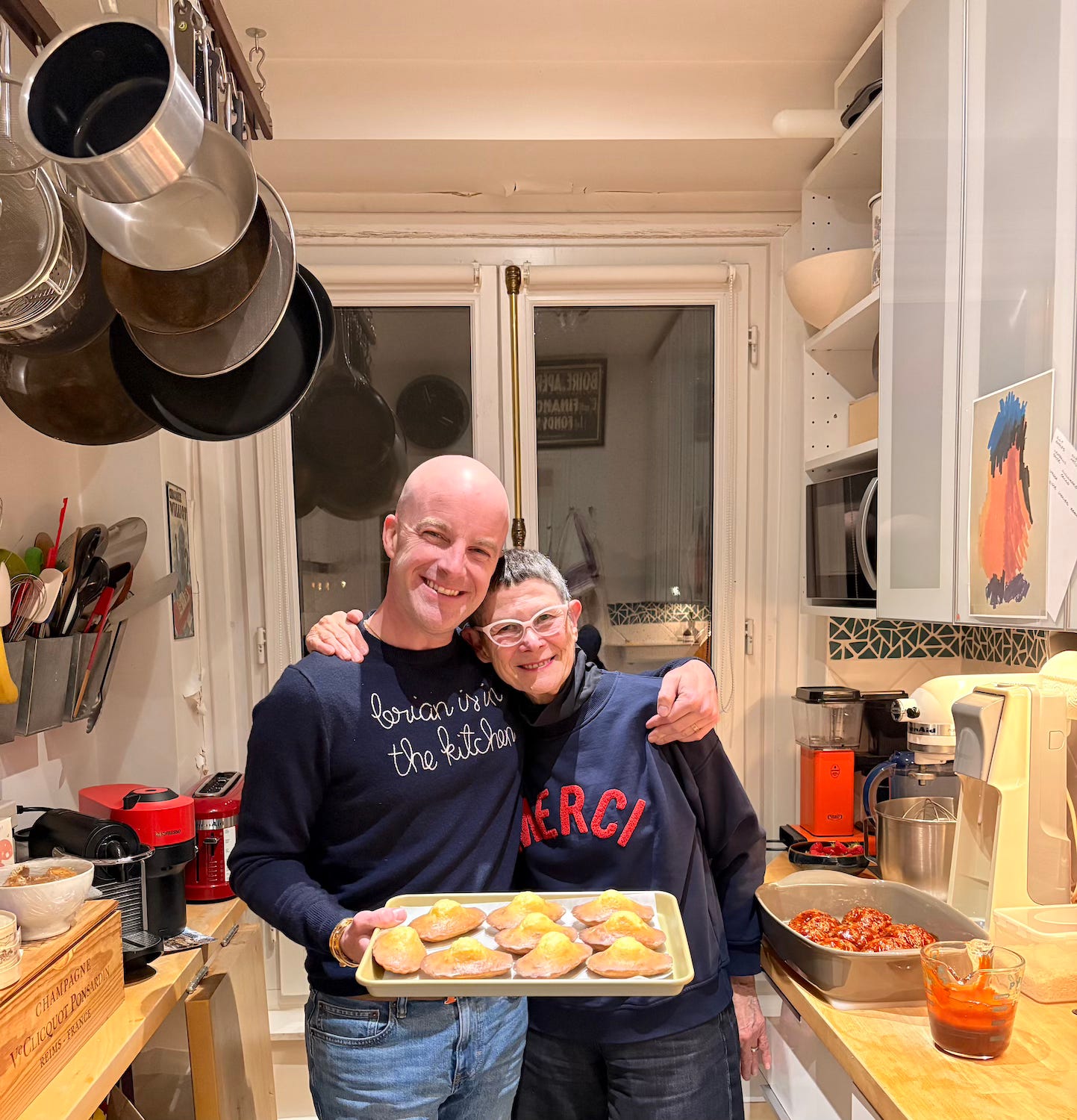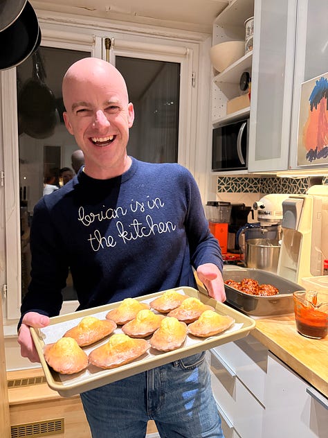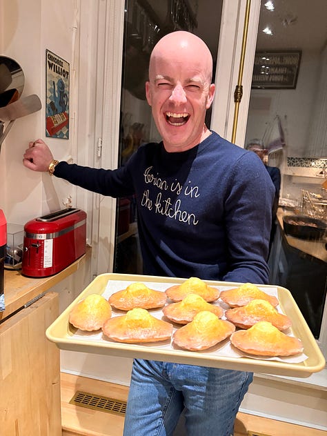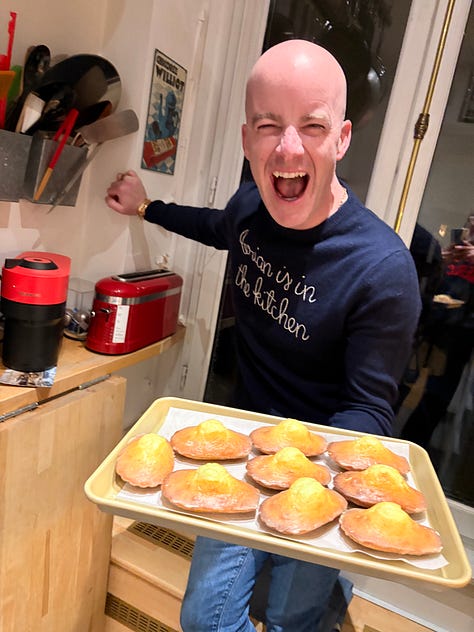 I discovered that Brian Hart Hoffman (who’s launching a Substack) adores madeleines when we went on a fabulous madeleine crawl together in Paris. And he’s not shy about proclaiming his love to the world. Here’s a video of Brian dancing around his kitchen while he makes the madeleines from Anytime Cakes [Bookshop.org // Barnes & Noble // Amazon].
