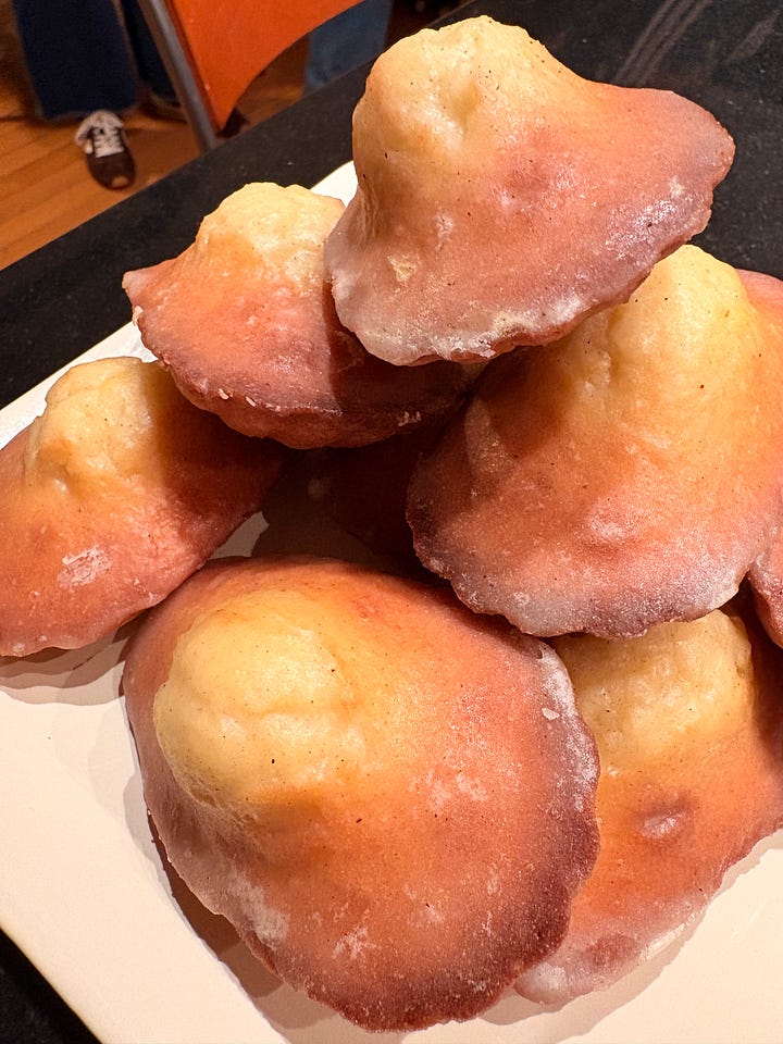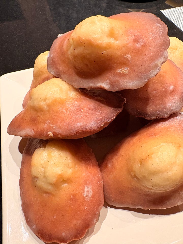 Before Dorie’s Anytime Cakes was published, I sent a special newsletter to paid subscribers with a preview of my madeleine recipe and notes on how I tested it. When you click through you can see the test pictures and find a fully updated recipe — open for a limited time to all subscribers. Also, when I first did the post, I recorded the recipe, something I’d forgotten I’d done. If you like hearing me tell you about the recipe, let me know and I’ll give it a try again soon.